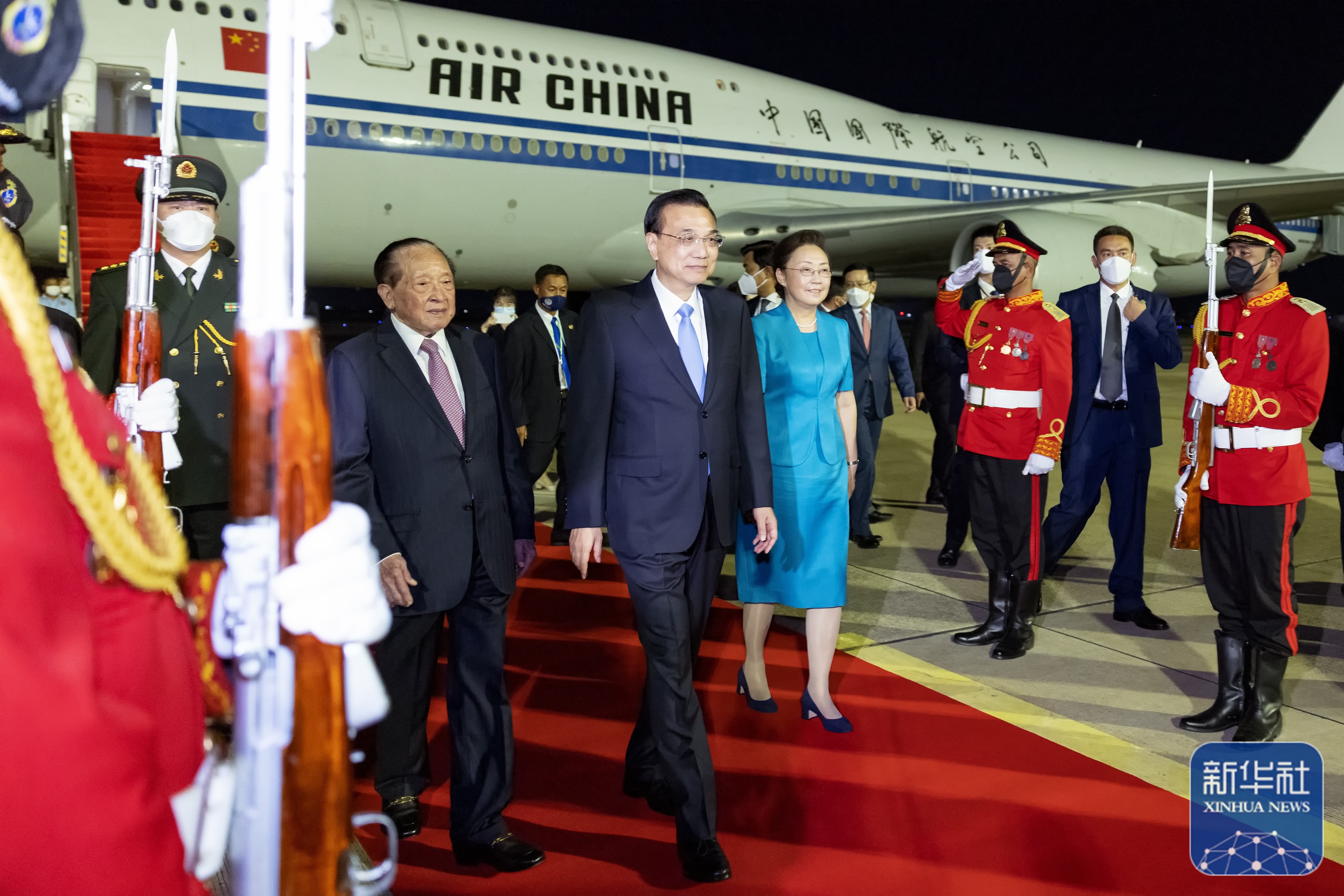 柬埔寨副首相贺南洪率政府高级官员到机场迎接。礼兵沿红地毯两侧列队致敬。当地青年向李克强和夫人程虹献上鲜花。中国驻柬埔寨大使王文天和驻东盟大使邓锡军也到机场迎接。