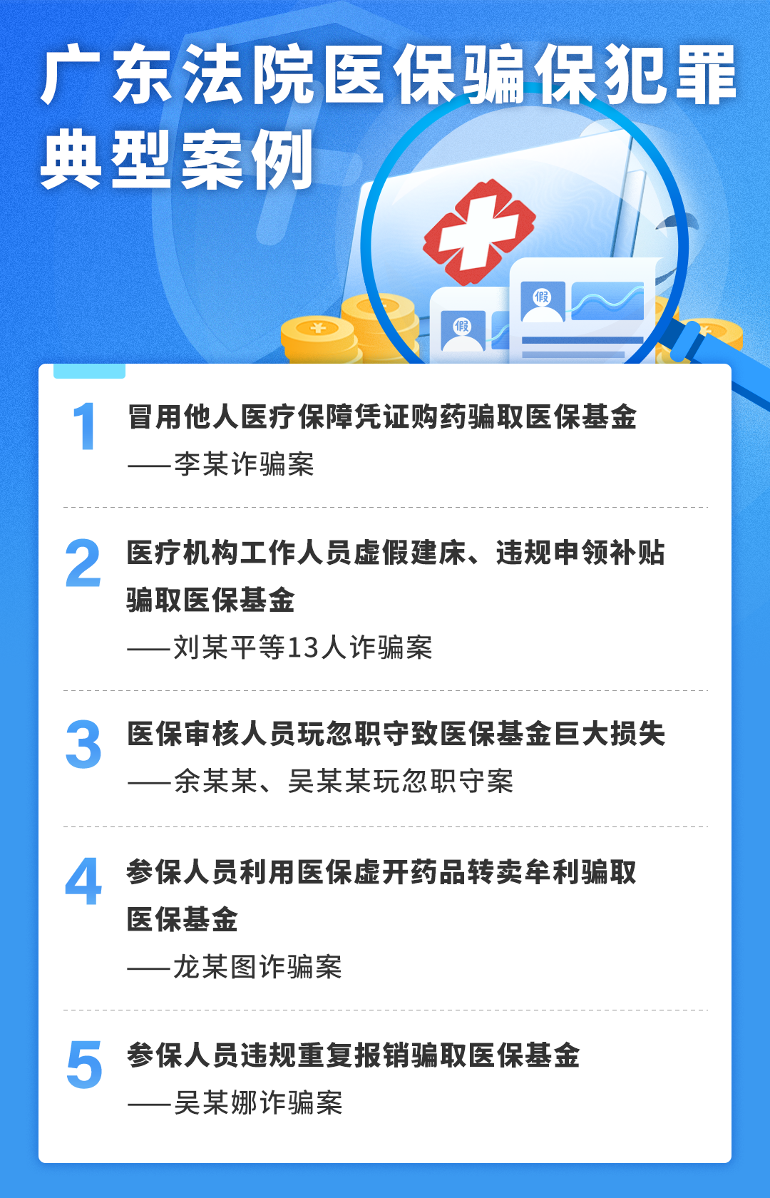 01 冒用他人医疗保障凭证购药骗取bet365中文官网基金 ——李某诈骗案 基本案情 2019年6月至12月期间,李某冒用参保人肖某华(2019年5月因病死亡)的名义,到某医院就诊开药,骗取bet365中文官网基金共计人民币6643.58元。案发后,李某的家属代为退缴全部违法所得。 裁判结果 法院审理认为,被告人李某以非法占有为目的,骗取居民bet365中文官网基金,数额较大,其行为已构成诈骗罪。鉴于其有认罪认罚、退缴违法所得等情节,可以从轻处罚。以诈骗罪判处李某有期徒刑八个月,缓刑一年二个月,并处罚金5000元。 典型意义 参保人员在享受医疗保障待遇的同时,有义务维护医疗保障基金持续健康发展,不得冒用他人医疗保障凭证,也不得将本人医疗保障凭证交由他人冒名使用。人民法院准确适用罪名,充分考虑行为人的行为性质、危害后果、主观恶性等方面因素,坚持宽严相济刑事政策,彰显了人民法院坚决维护bet365中文官网基金安全,以及对该类诈骗bet365中文官网基金犯罪行为依法惩处的决心。 02 医疗机构工作人员虚假建床、违规申领补贴骗取bet365中文官网基金 ——刘某平等13人诈骗案 基本案情 某中医院是一家营利性民营医疗机构和bet365中文官网定点机构,刘某平是该医院的董事长和实际控制人。2017年11月起,刘某平、王某岭等人指使医院员工让享受bet365中文官网待遇的参保人员免费住院,以虚开医嘱、虚构医疗项目、虚开药品、伪造病历材料等方式,向某市bet365中文官网局虚假申报住院人次和医疗费用骗取bet365中文官网基金。自2017年11月起至2021年3月期间,该医院介绍虚假病人入院共8100余人次,骗取国家bet365中文官网基金高达2385万余元。其中,刘某平负责组织、策划、指挥医院的医护人员进行诈骗,王某岭负责对中介获利数据的审核、对医院内部人员的合谋诈骗配合行动进行管理。同案人林某龙、覃某伦、郭某军、邱某梅、邓某玲、何某、张某、潘某成、王某娣、梁某荣、植某明等11人分工负责协助刘某平实施诈骗。 裁判结果 一审法院审理认为,被告人刘某平等人结伙以非法占有为目的,采用虚构事实的方法,利用医疗保险政策,虚报医疗保险基金,骗取国家医疗保险基金,数额特别巨大,其行为均已构成诈骗罪。按各被告人在共同犯罪中的作用大小、犯罪情节、退赃退赔情况等,对被告人刘某平等人分别判处了有期徒刑十五年至三年,并处罚金,并对非法所得、犯罪物品等涉案财物依法处理。宣判后,刘某平等人提出上诉,二审法院依法维持一审判决。 典型意义 定点医疗机构应当加强行业自律,规范医药服务行为。定点医疗机构有组织团伙式作案,全链条专业化造假,骗取bet365中文官网基金数额特别巨大,行为性质极其恶劣,社会危害性极大。人民法院发挥刑事审判职能作用,准确认定刑事责任,对刘某平等人判处有期徒刑十五年至三年不等刑罚,充分体现对bet365中文官网定点机构骗取bet365中文官网基金的行为依法严惩精神,有力维护了医疗保障制度健康持续发展。 03 bet365中文官网审核人员玩忽职守致bet365中文官网基金巨大损失 ——余某某、吴某某玩忽职守案 基本案情 2013年1月至2016年10月间,时任某县级市医院院长彭某某(已判刑)等人利用国家对残疾儿童医治政策,诱骗残疾人家属信任,先后对多名残疾患者通过虚开治疗次数、伪造住院治疗相关材料,虚开治疗费、药费等方式骗取bet365中文官网基金。时任该县级市社保局副局长的吴某某及该局城乡居民医疗保险股股长的余某某负责复核、审核该医院每月报送的残疾儿童医疗费用报销,二人未认真执行国家bet365中文官网报销文件规定,对该医院上报的相关报表、凭证等资料未认真审查即通过,亦未组织、督促对该医院进行定期或不定期的实地监督检查,对该医院出现同一群体残疾儿童长年累月、连续性住院治疗、报销的“挂床”异常情况未给予应有的关注,致使该医院骗取国家bet365中文官网基金,造成国家财产巨大损失。经审计,被某县级市医院骗取的bet365中文官网基金中,经吴某某审核的数据为人民币875余万元,经余某某复核的数据为人民币521余万元。 裁判结果 一审法院审理认为,吴某某、余某某身为国家机关工作人员,在工作中严重不负责任,不正确履行自己的工作职责,致使公共财产、国家和人民利益遭受重大损失,情节特别严重,以玩忽职守罪分别判处吴某某有期徒刑三年六个月、余某某有期徒刑三年。宣判后,二人提出上诉,二审法院依法维持原判。 典型意义 bet365中文官网基金主管部门工作人员有义务严格核查报销材料的真实性、完整性和有效性,发现问题应及时纠正进行处理。人民法院准确区分责任,综合考虑被告人的工作职责、失职情况、量刑情节和犯罪后果依法作出判决,积极延伸审判职能作用,通过案件审理推动主管部门及时健全工作机制、堵塞漏洞,为促进医疗保障制度持续健康发展提供强有力司法服务保障。 04 参保人员利用bet365中文官网虚开药品转卖牟利骗取bet365中文官网基金 ——龙某图诈骗案 基本案情 龙某图于2019年2月申请了某市基本医疗保险门诊慢性、门诊特定病种(以下简称“门特”),取得门特待遇后到定点医院开药获得bet365中文官网药品。2020年7月18日至2021年4月3日,龙某图在明知超量开药的情况下仍不合理从三家医院开药,共计八次转卖给蓝某某牟利,骗取bet365中文官